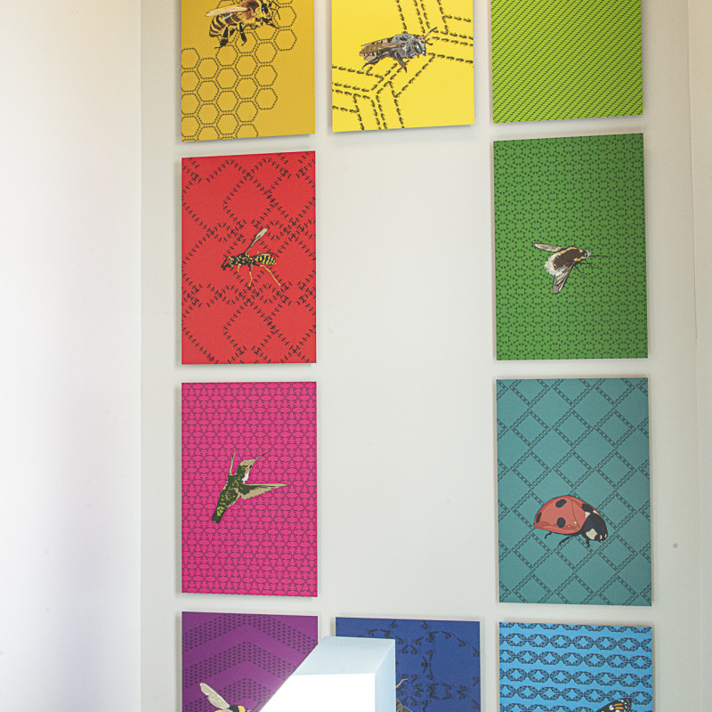 Que ce soit par la performance, le dessin, l’installation ou la peinture, mon imaginaire appartient à l’univers du jeu et est habité par une certaine nostalgie de l’enfance. Je travaille notamment avec des matériaux recyclés comme des capots de voiture, des jouets, des bibelots, du mobilier et du verre brisé. Je m’intéresse, dans ma pratique en galerie, au mythe de l’éternelle jeunesse et au contrôle des masses. Mes œuvres les plus récentes consistent en des installations murales monumentales où sont recomposées en modules des enluminures proposant une relecture d’œuvres littéraires comme : La ferme des animaux de Orwell, Gaspard, Melchior & Balthazar de Tournier ou Le gène égoïste de Dawkins. J’ai développé un intérêt pour les propriétés signifiantes et plastiques de matériaux comme le plâtre, le plaquage métallique, l’enluminure et le bois. Ainsi j’étudie les potentialités qu’offrent des techniques traditionnelles liées aux arts sacrés les faisant se côtoyer à des techniques commerciales et industrielles. Mon intérêt pour l’intégration des arts à l’architecture s’arrime à mon désir d’entrer en contact direct avec le spectateur dans l’espace public, imaginant des possibilités infinies de dialogues entre l’architecture, le corps et l’objet d’art.