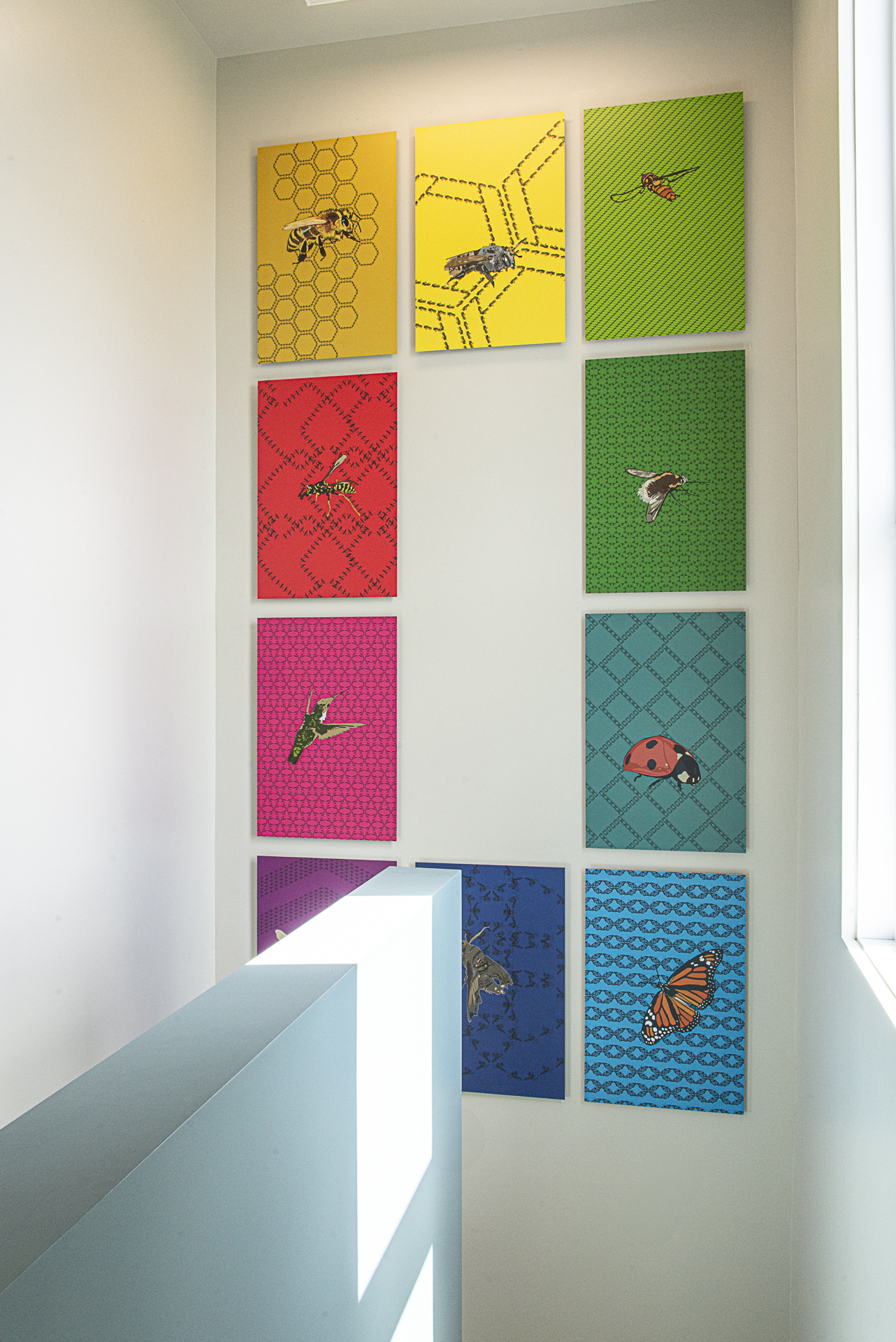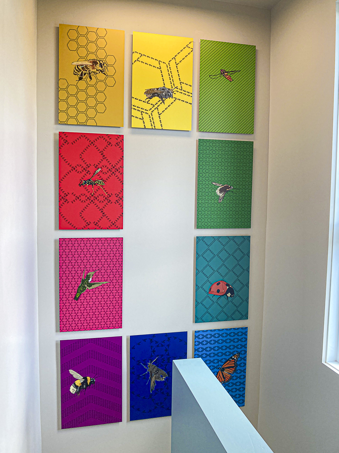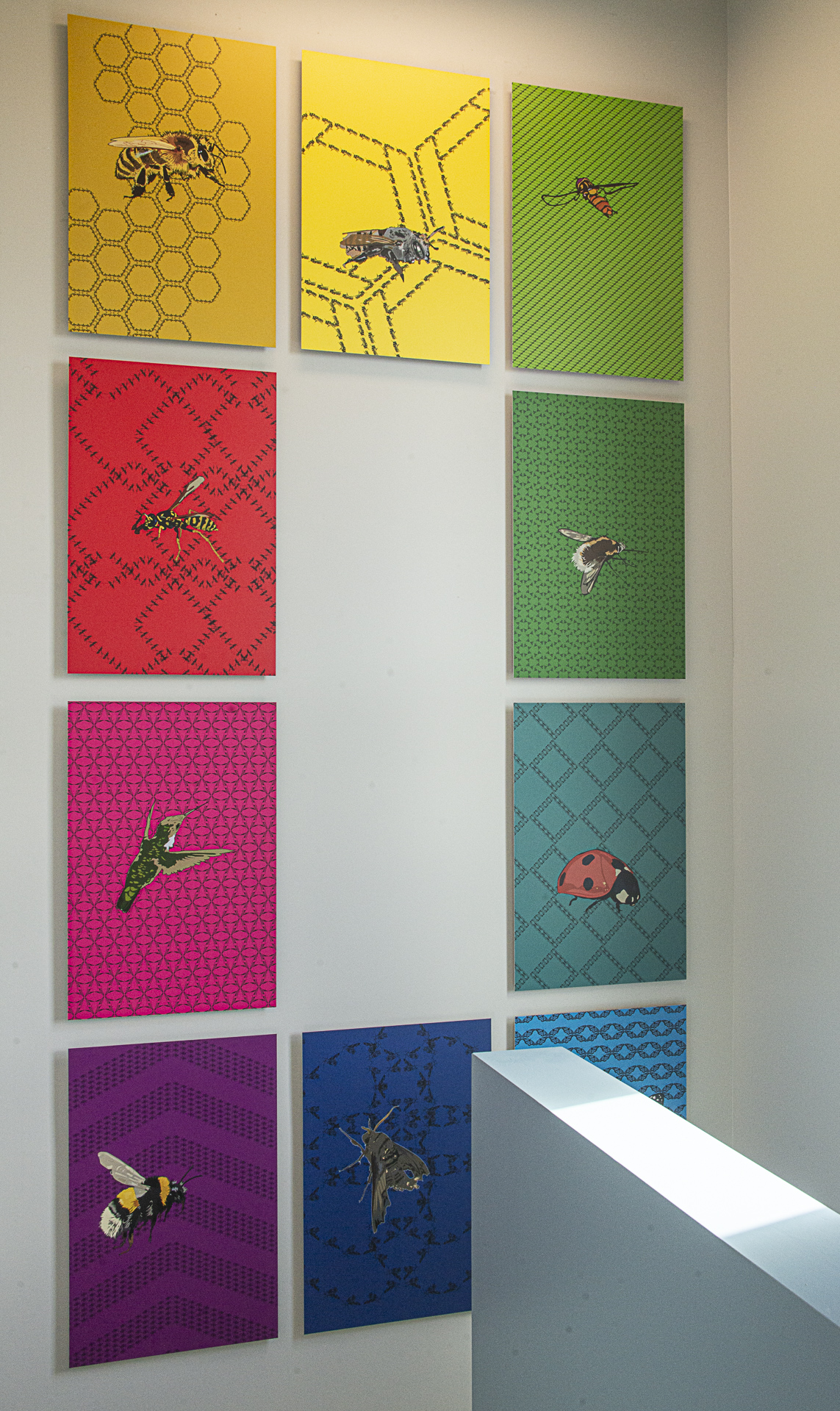 Ils sont appliqués sur des fonds de couleurs vives qui évoquent la diversité des espèces, tant du côté des fleurs que de leurs pollinisateurs, les deux ayant coévolués ensemble et étant en perpétuelle communication visuelle. Chaque pollinisateur est pourvu de particularités physiques et comportementales qui font qu’ils sont complémentaires les uns aux autres, assurant la reproduction d’une variété infinie de fleurs. Certains butinent de jour, d’autres de nuit, les uns préférant les petits pétales plats et jaunes, les autres la large corolle blanche et odorante.