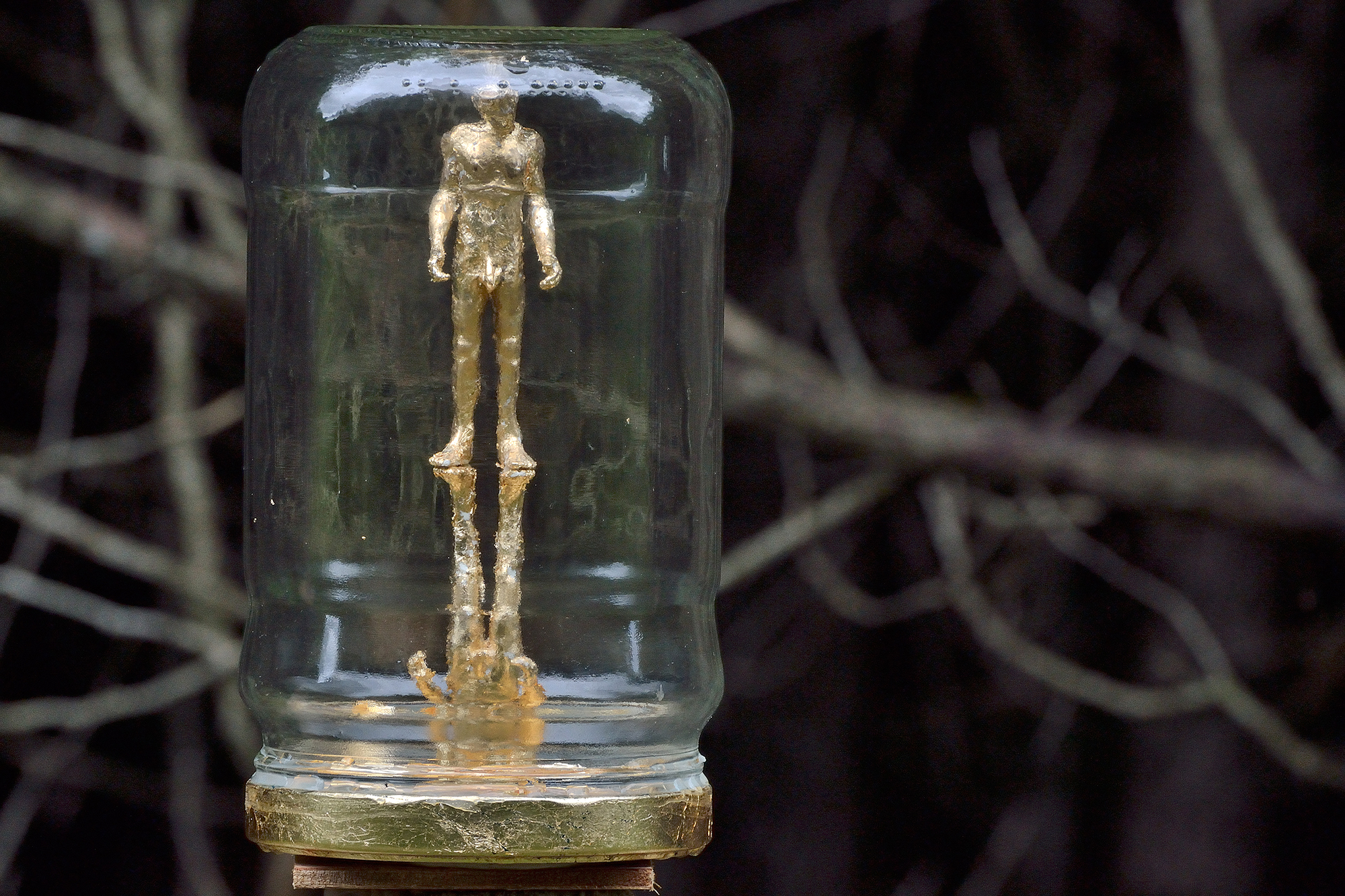 Hommage du double, naitre deux fois, 2014, bocal d'olive, résine et feuilles dorées. 20 x 10 x 10 cm