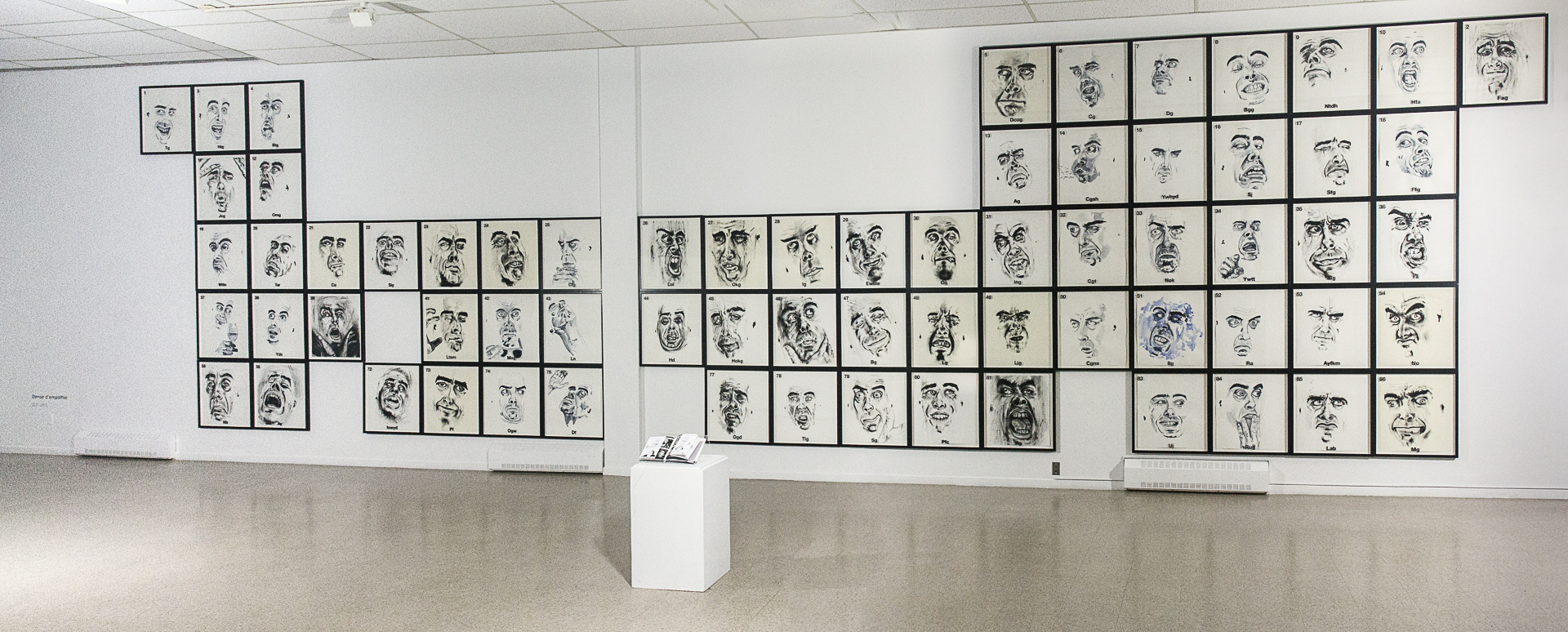 Devoir d’empathie est une étude portant sur les mèmes (en anglais memes), forme de langage visuel vernaculaire popularisé par les médias sociaux. Près de la culture des émoticons, ces illustrations proposent une nouvelle synthèse langagière exprimant des émotions ambigües. Inspiré par les théories de la mémétique de R. Dawkins, j’essaie, par le truchement du mimétisme et la réinterprétation au dessin et à l’aquarelle d’autoportraits photographiques, de me réapproprier ces codes idiomatiques. Se déployant sous la forme d’un tableau périodique grand format, l’installation puise dans la culture scientifique l’expression d’un désir d’organisation de l’expérience sensible.