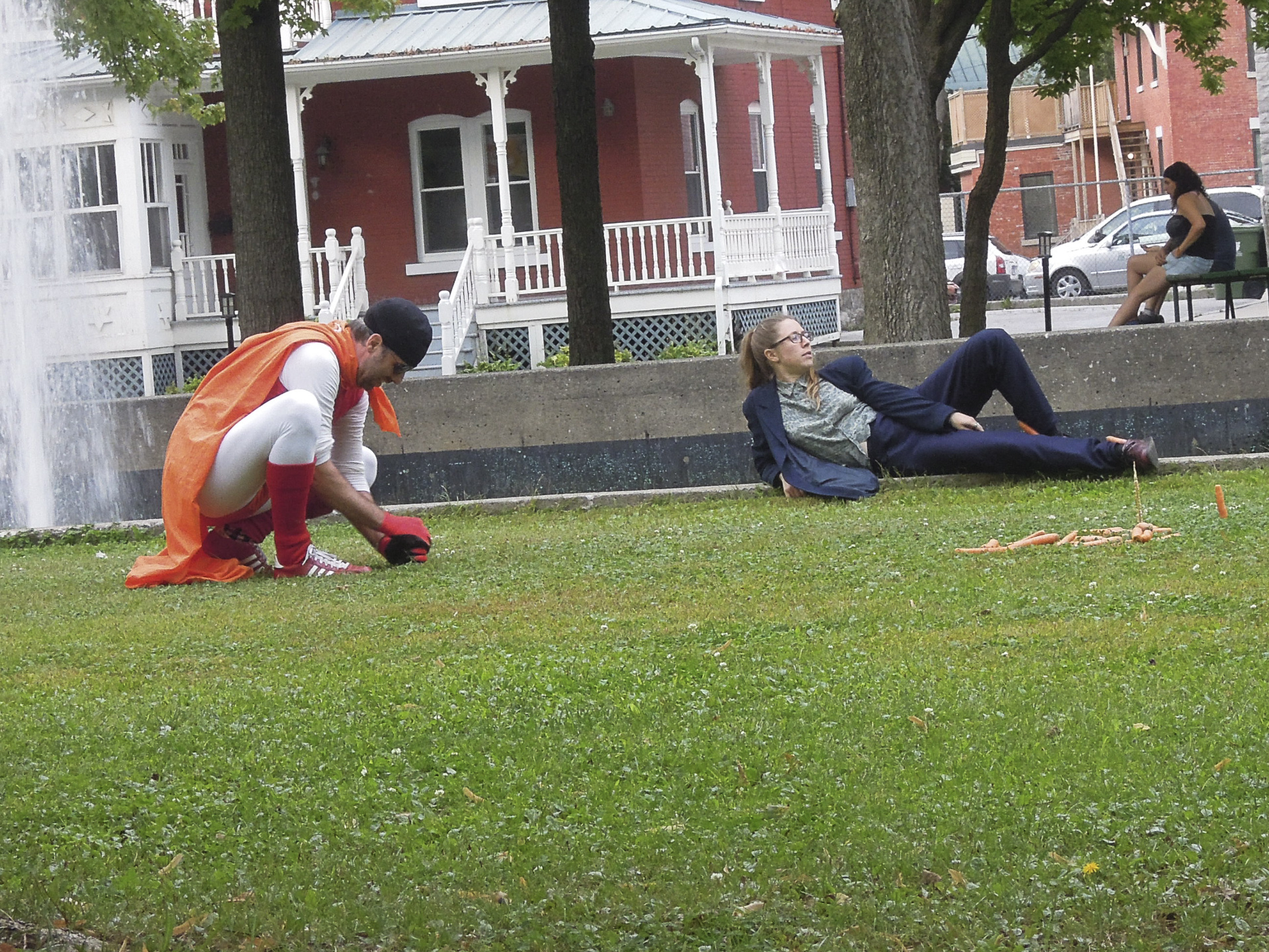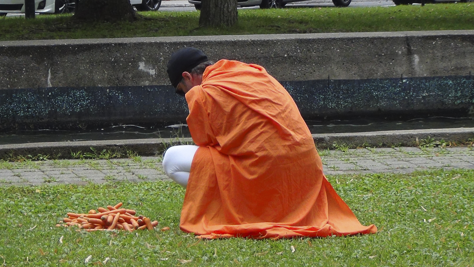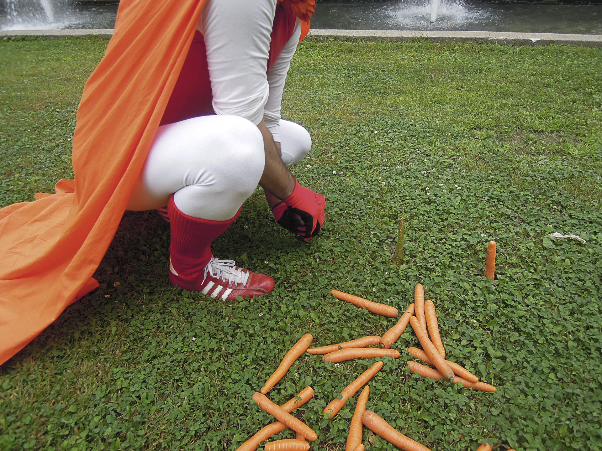 S’offrir un sujet trop grand pour soi : un légume racine porteur de royauté. Porter sur soi quelque chose comme un symbole de réussite ; la carotte doré. Arborer la racine phallique comme objet transactionnel, voir l’impératif de la verticalité dans le déploiement d’un territoire inventé. Échouer à pousser la mélodie, angoisser au contact de la misère de la communauté local, prendre des cours d’équitation avec une jument virile, plus virile que soi. S’approprier un lieu, une zone dans le parc public. Trouver le bon moment grâce aux gestes d’une amie, puiser à même cette présence la concrétisation de ses propres gestes. (Merci Arkadi)