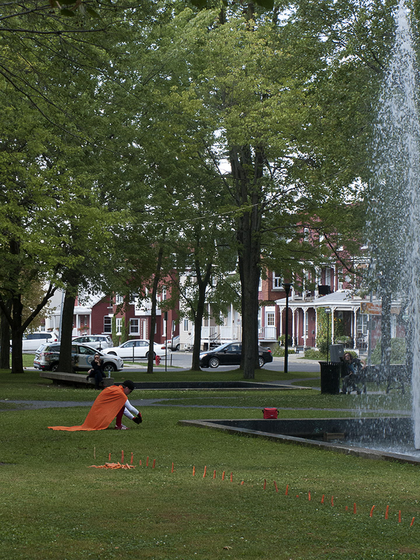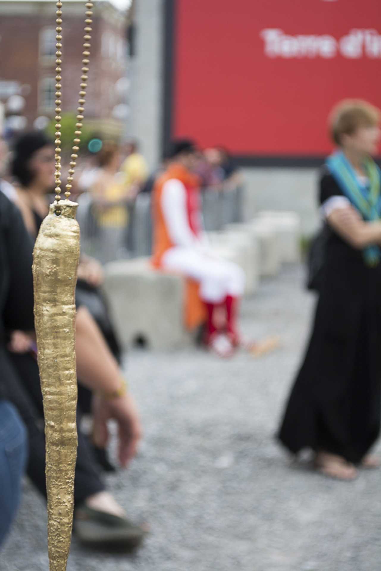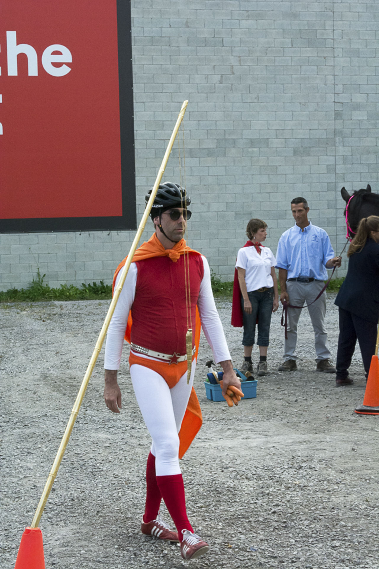 S’offrir un sujet trop grand pour soi : un légume racine porteur de royauté. Porter sur soi quelque chose comme un symbole de réussite ; la carotte doré. Arborer la racine phallique comme objet transactionnel, voir l’impératif de la verticalité dans le déploiement d’un territoire inventé. Échouer à pousser la mélodie, angoisser au contact de la misère de la communauté local, prendre des cours d’équitation avec une jument virile, plus virile que soi. S’approprier un lieu, une zone dans le parc public. Trouver le bon moment grâce aux gestes d’une amie, puiser à même cette présence la concrétisation de ses propres gestes. (Merci Arkadi)